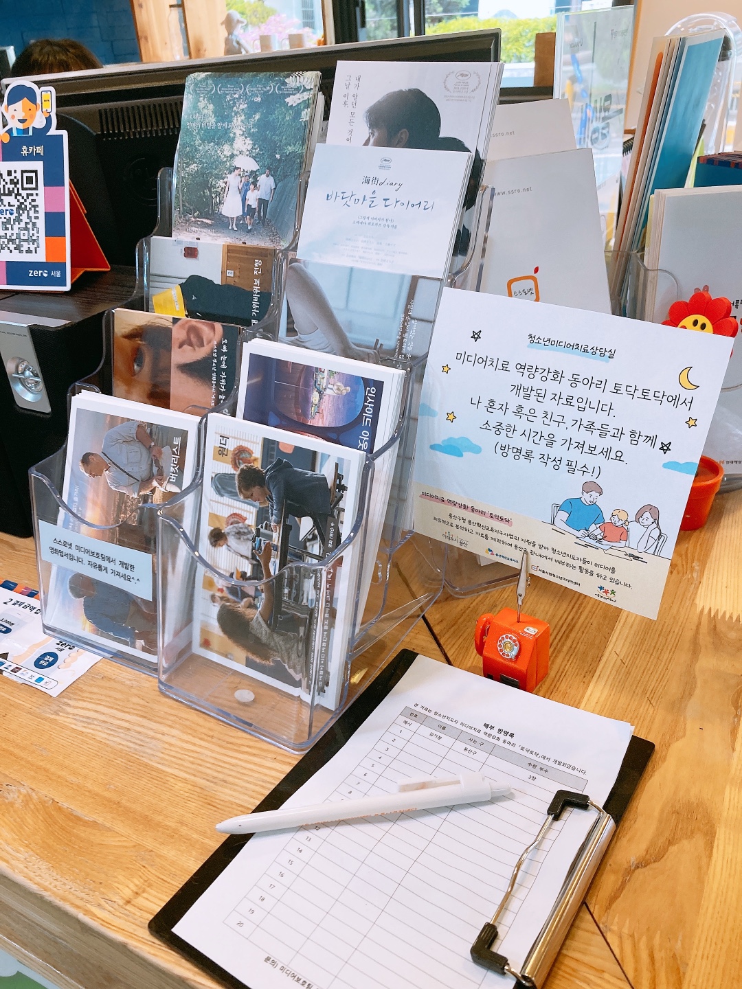 미디어센터 내부에 <영화치료 엽서> 배포 부스를 마련하여