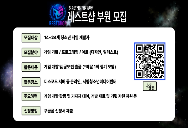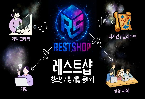 <레스트샵>은 14~24세 청소년들이 모여 게임을 분석/연구/개발하는 게임제작동아리입니다.